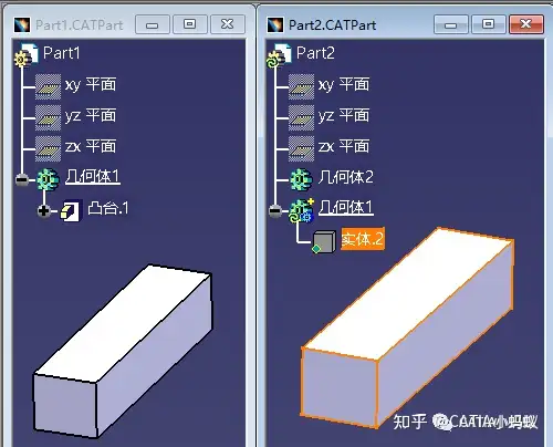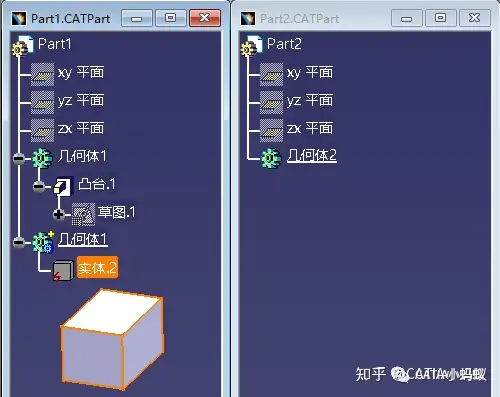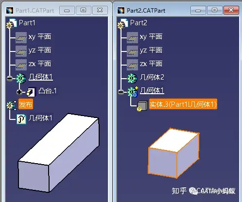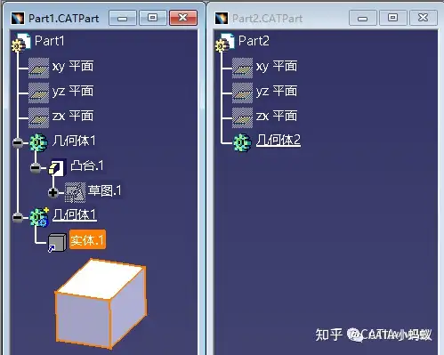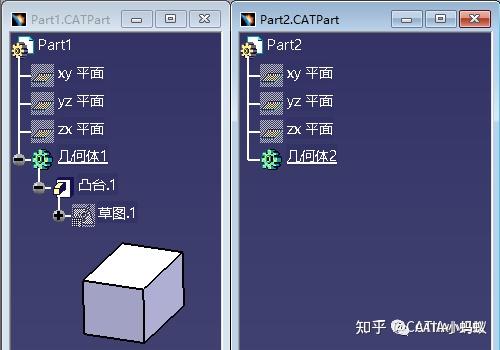 为了学习研究,我们先创建两个Part模型,并在其中一个Part中创建一个凸台特征,另一个Part保留为空几何体即可(目的:为了两个Part之间进行关联设计)