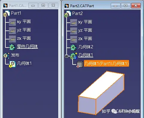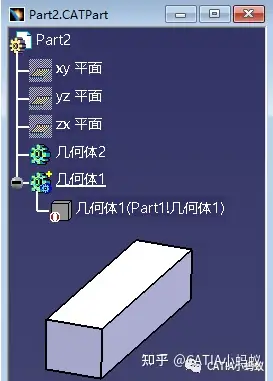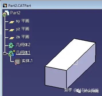 承接上面,我们将Part1,Part2都保存在本地并全部关闭,然后再打开Part2文件,此时几何体1下的实体上显示了一个问号的标识,即,实体在CATIA软件中无法找到他所关联的对象,因为Part1没有打开。 此时我们再打开Part1,发现实体上的问号又变成了绿色小点点标识,即实体找到了它的link对象。